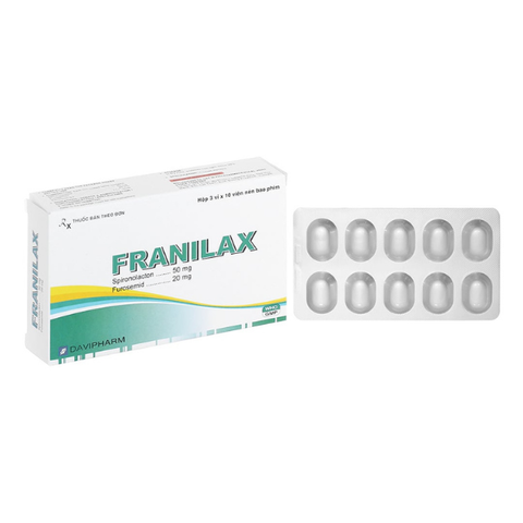 Franilax chứa một thuốc lợi tiểu tác dụng ngắn và một thuốc kháng aldosteron tác dụng kéo dài. Được chỉ định điều trị phù kháng thuốc liên quan cường aldosteron thứ phát. Các tình trạng bao gồ suy tim sung huyết mạn tính và xơ gan.
